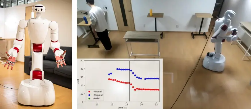 協調作業チームでは、人と同じ場所で同様のタスクを協力して行う人型協働ロボットにおいて、状況に応じて適切なタスクを各エージェントに割り振る必要があります。その際、協働者の意図を考慮した行動決定により、円滑な協働作業を実現できる場合があるため、周囲の状況と協働者の意図に応じて主張・同調を使い分ける「譲り合い」の判断を有するロボットシステムを開発しています。