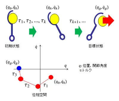 計算機により機械動作を最適化して、最短時間動作や最小エネルギー動作などを計画できれば、機械作成コストや機械運用コストが大きく削減できます。本プロジェクトでは、任意に与えられた運動方程式から最適動作を計算するソルバを作成しています。