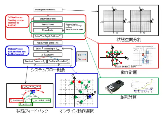 機械が持つ運動状態は位置(関節角度を含む)と速度(関節角速度を含む)で記述できます。位置と速度が同じであれば機械状態も等しいので機械の動作は位置と速度の軸を持つ位相空間上に一本の線として描くことができます。本研究ではこの位相空間上において機械の初期状態から目標状態までを結ぶ最適動作(経路)の計算を扱っています。この最適動作は具体的には最短時間動作やエネルギー最小動作などです。我々が構成した最適動作計算ソルバは下図のフローに従って計算を実行します。状態空間分割部では状態空間をいくつものセルに分割し似た機械状態の検索を高速化します。動作計画部では状態空間全体に均等な探索を行うとともに最適性の低い動作を切り捨てる枝刈りという計算を行います。これらのプロセスは並列計算機GPUに実装されており1024基の計算コアで同時に計算ができます。動作計画部が終わるとソルバが計算した準最適動作がデータベースに蓄えられ次は実際の機械制御に移ります。オンライン動作選択部では外乱によって乱されたそれぞれの機械状態から目標状態までの適切な動作をデータベースから検索し常に準最適動作を保証します。状態フィードバック部ではオンライン動作選択部が探した準最適動作を実現するための微細な制御を行います。