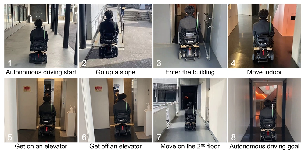 屋内外での自律移動にも取り組んでおり,規定寸法内かつ操作者に支障のない位置にセンサを設置し,自己位置推定・障害物認識・経路生成を実現しています.加えて,自律走行中でも操作者がシームレスに介入可能なオーバーライド手法も開発しています.