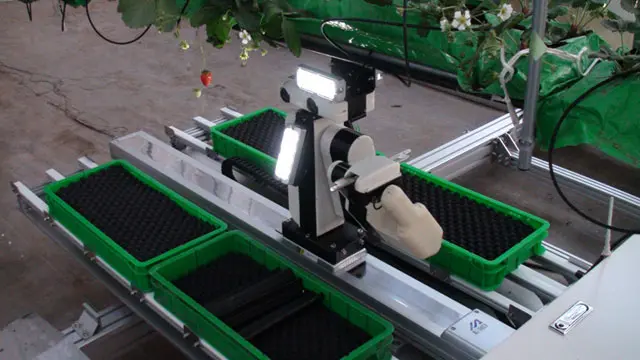 圃場にレールを敷き、圃場内を自動的に移動しながら、マニピュレータによっていちご果実を収穫し、トレイに配置します。作業は夜間に行うため、いちご認識のためのステレオカメラおよび照明装置を装備しています。