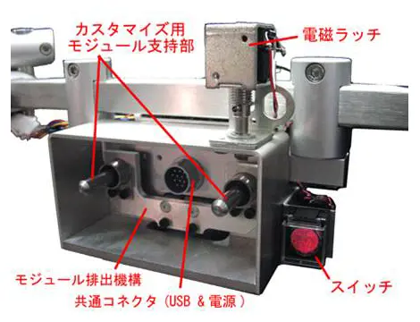 カスタマイズポートは、カスタマイズ用モジュールを支持するために堅牢なつくりになっております。 カスタマイズを認識するハードウェアはPCのためのUSBを流用しました。 モジュール排出機構はポート背面に備え付けられたサーボモータによって取り付けられたモジュールを押し出す機構であり、ユーザ(被験者)による引抜を拒否するための保持機構として電磁ラッチを備えております。 ユーザ(被験者)が排出を命令するためのスイッチも備えております。