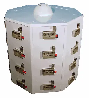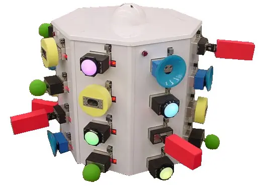 このカスタマイズポートを複数搭載し、基本的な移動機構として前方向移動台車を備えたロボットWEAR(Waseda Extendable ARchitecture)を構築した図を以下に示します。 WEARは正八角柱の外観をしており、高さ800[mm]、幅800[mm]、重量は約76[kg]です。 八角柱の各側面に各4つのカスタマイズポート、計32個のカスタマイズポートを有しており、底部には全方向移動台車を装備しております。 上面には半球状のドームが見えますが、これはユーザ(被験者)を認識するための人体感知センサ(焦電型赤外線センサ)を搭載しております。 WEAR本体は、我々の研究の視点から考え、ユーザ(被験者)がWEARとのインタラクションの最中に遊び方が創出される過程を観察するために、一見してインタラクションの仕方、つまりこのロボットとの遊び方をイメージさせるようなデザインを排除するように設計しました。