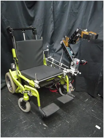 車椅子利用者の日常生活支援を目的として、車椅子にロボットアームを搭載し、インターフェースや知的操作支援技術の開発により、「床に落ちたものを拾う」「机の上にある飲み物を口元に運ぶ」「ドアを開ける」「顔を掻く」などの作業の支援を目指しています。