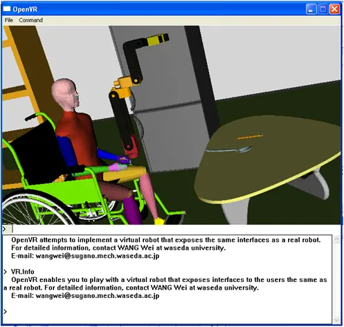 ソフトウェア・プラットフォームの開発においては、ProEやSolidworksからのCADデータを直接使用しバーチャルロボットや世界モデルを構築できる“Open Virtual Robot”(OpenVR)というソフトウェア・プラットフォームを開発しました。OpenVRを用いると、パソコン上でロボット実機を模擬することができ、実際に使っているロボットと同様のバーチャルロボットを研究者に提供可能なため、アルゴリズムの開発など様々な場面で研究開発を支援することができます。図2に車椅子ロボットを用いた日常生活支援の様子を示します。